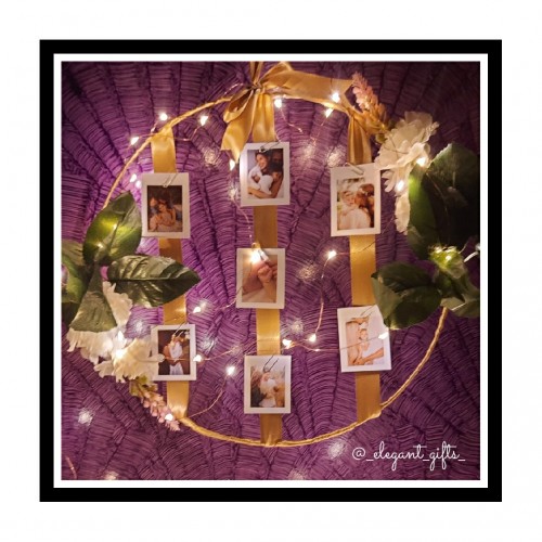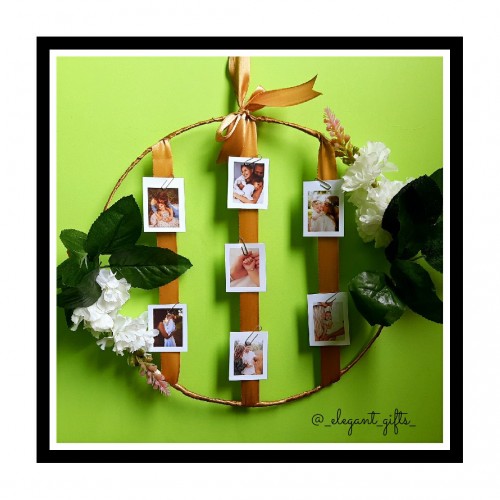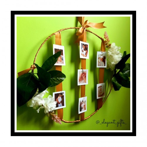 Adorable photo ring made with metal string and has twine with mini clips to hold your photos and messages. The crinkle spiral flowers are each hand cut/ scuplted with ribbon strips and customised to include any color.